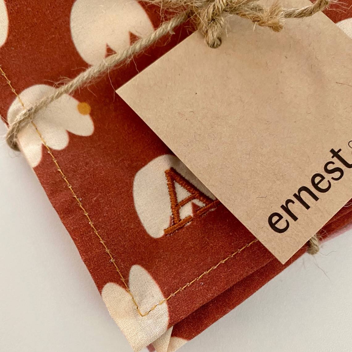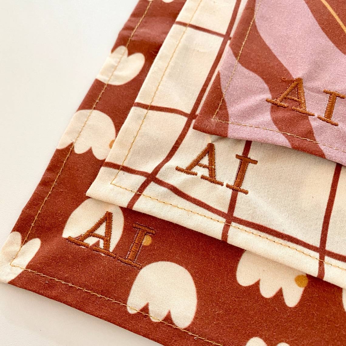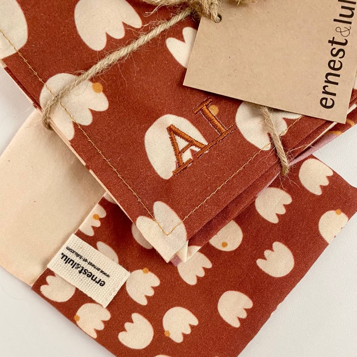 Ici, les collections de mouchoirs en tissu jeanne&bernard, les mouchoirs sont personnalisés avec les initiales AI en écriture Script.